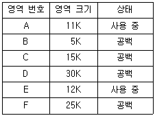 주기억장치 배치 전략 기법으로 First Fit 방법을 사용할 경우, 다음과 같은 기억장소 리스트에서 10K 크기의 작접은 어느 영역에 할당되는가?(단, 탐색은 위에서 아래로 한다.)