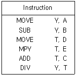 다음 마이크로오퍼레이션을 수행하였을 때 계산되는 수식은?(단, 니모닉 명령어의 덧셈은 ADD, 뺄셈은 SUB, 곱셈은 MPY, 나눗셈은 DIV로, 이동은 MOVE로 정의한다.)