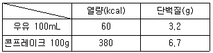 아침식사로 우유 1컵(200mL)과 콘플레이크(50g)를 먹었다면 섭취한 총열량과 총단백질량은?