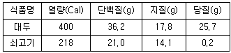 다음 식품성분표에서 단백질을 대두 50g대신 쇠고기로 대치하고자 할 때 쇠고기의 양으로 적당한 것은?