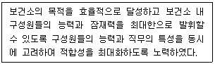 A보건소의 보건소장은 보건인력들의 효과적인 인력배치를 위해 <보기>와 같은 인력배치 원칙을 준용하였다. <보기>의 설명에 해당하는 인력배치의 원칙으로 가장 옳은 것은?