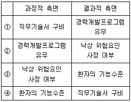 도나베디언(Donabedian)의 간호업무 질 관리 접근방법에서 고려될 수 있는 평가항목을 과정적 측면과 결과적 측면 순서대로 바르게 나열한 것은?