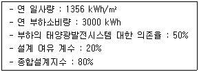 다음과 같은 조건에 적합한 자가소비형 태양광발전시스템의 설치용량은 약 몇 kWp 인가? (단, STC 조건을 기준으로 한다.)
