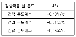 현장에 설치된 태양광발전설비에서 외기온도 37℃일 때 다음 모듈의 셀 표면 온도는? (단, 패널 표면의 일사량은 1000W/m2이다.) 정상작동 셀 온도 45℃ 전력 온도계수 -0.43%/℃ 전압 온도계수 -0.31%/℃ 전류 온도계수 +0.05%/℃