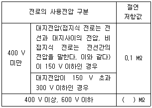 괄호 안에 들어갈 절연저항 값은 몇 ㏁인가?(관련 규정 개정전 문제로 여기서는 기존 정답인 2번을 누르면 정답 처리됩니다. 자세한 내용은 해설을 참고하세요.)