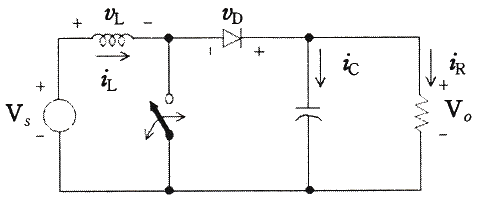 회로에서 입력전압 24V, 스위칭 주기 50㎲, 듀티비 0.6, 부하저항이 10Ω일 때, 출력전압 VO는 몇 V인가? (단, 인덕터의 전류는 일정하고, 커패시터의 C는 출력전압의 리플 성분을 무시할 수 있을 정도로 매우 크다.)
