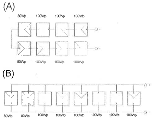 그림 (A), (B)에서 각 모듈별 음영 발생 시 발전량을 바르게 나타낸 것은? (단, 음영 부분의 발전량은 80Wp이다.)