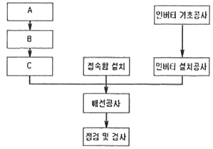 그림은 태양광발전시스템의 일반적인 시공절차이다. A, B, C의 알맞은 순서 내용을 올바르게 나타낸 것은?