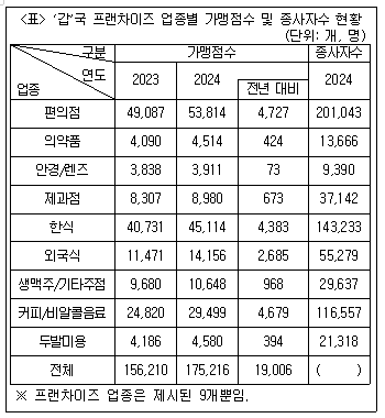 다음 <표>는 2023년과 2024년 ‘갑’국의 프랜차이즈 가맹점에 관한 자료이다. 이에 대한 설명으로 옳은 것은?