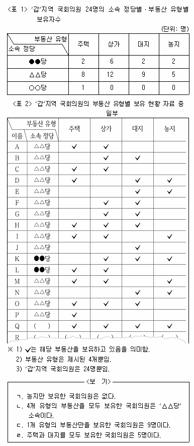 다음 <표>는 ‘갑’지역 국회의원 24명의 부동산 보유 현황에 관한 자료이다. 이에 대한 <보기>의 설명 중 옳은 것만을 모두 고르면?