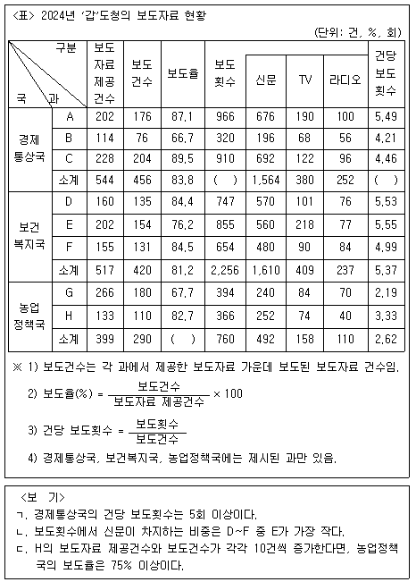 다음 <표>는 2024년 ‘갑’도청의 보도자료 현황에 관한 자료이다. 이에 대한 <보기>의 설명 중 옳은 것만을 모두 고르면?