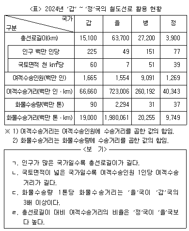 다음 <표>는 2024년 ‘갑’~‘정’국의 철도선로 활용 현황에 관한 자료이다. 이에 대한 <보기>의 설명 중 옳은 것만을 모두 고르면?