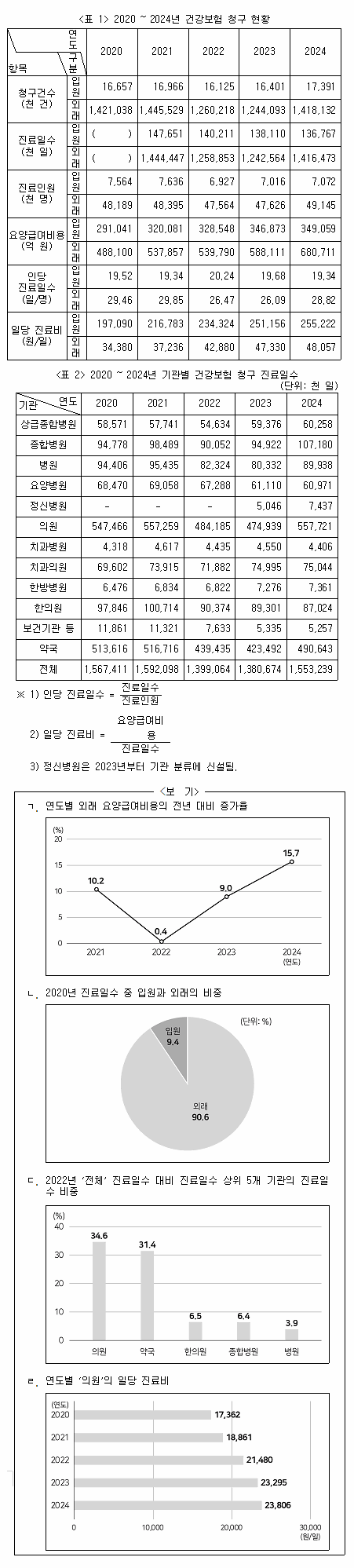 다음 <표>는 2020~2024년 ‘갑’국의 건강보험 청구 현황 및 기관별 건강보험 청구 진료일수에 관한 자료이다. 이를 이용하여 작성한 <보기>의 그래프 중 옳은 것만을 모두 고르면?