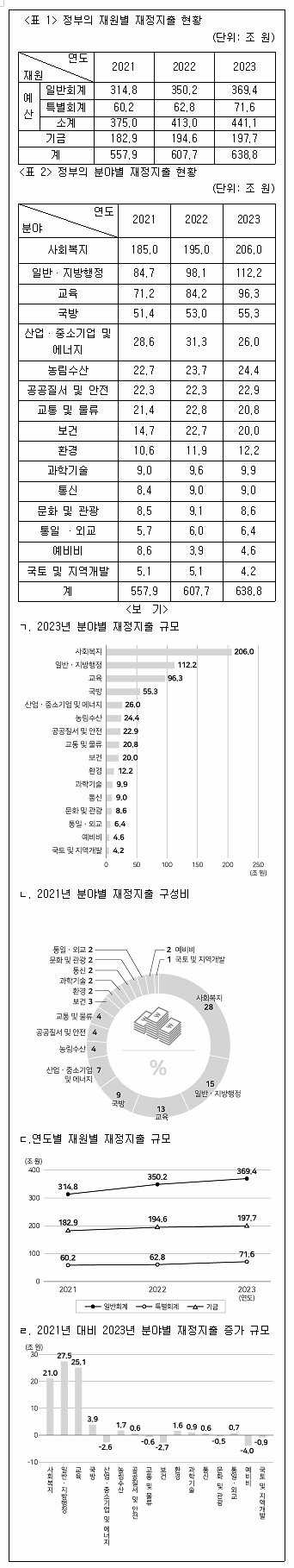 다음 <표>는 2021~2023년 정부의 재원별, 분야별 재정지출 현황에 관한 자료이다. 이를 이용하여 작성한 <보기>의 그래프 중 옳은 것만을 모두 고르면?