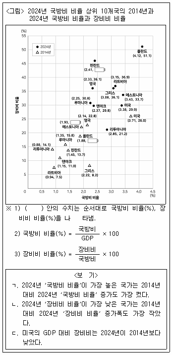 다음 <그림>은 NATO 회원국 중 2024년 국방비 비율 상위 10개국의 국방비에 관한 자료이다. 이에 대한 <보기>의 설명 중 옳은 것만을 모두 고르면?