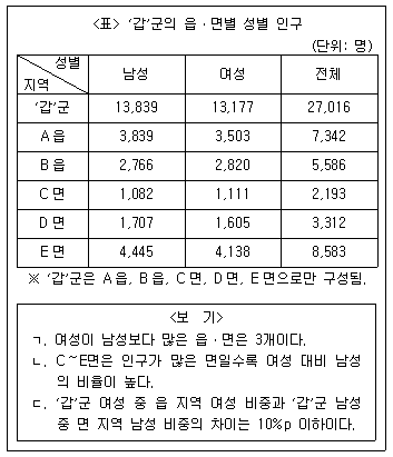 다음 <표>는 ‘갑’군의 읍ㆍ면별 성별 인구에 관한 자료이다. 이에 대한 <보기>의 설명 중 옳은 것만을 모두 고르면?