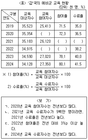 다음 <표>는 2019~2024년 ‘갑’국의 예비군 교육 현황에 관한 자료이다. 이에 대한 <보기>의 설명 중 옳은 것만을 모두 고르면?