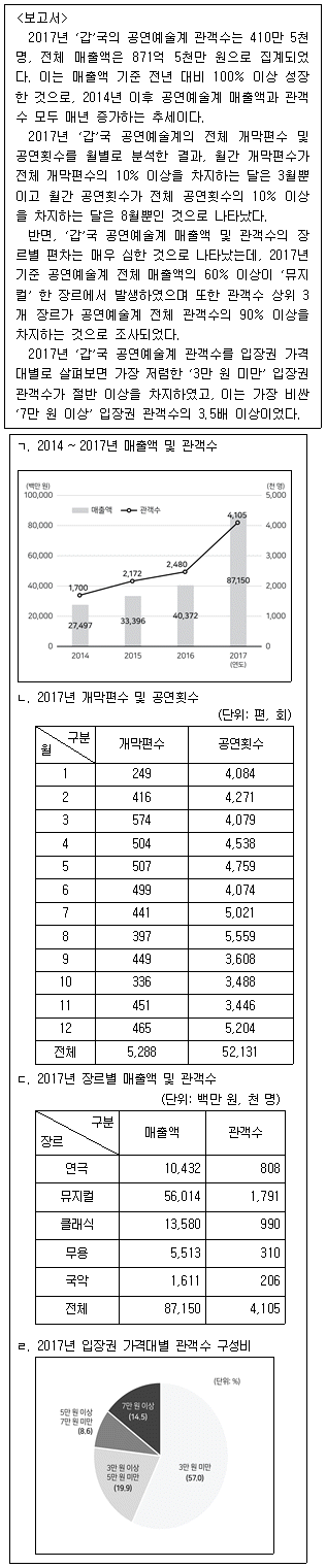다음 <보고서>는 2017년 '갑'국의 공연예술계 시장 현황에 관한 자료이다. <보고서>의 내용과 부합하는 자료만을 <보기>에서 모두 고르면?