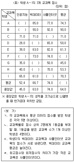 다음 <표>는 '갑'대학교 정보공학과 학생 A~I의 3개 교과목 점수에 관한 자료이다. 이에 대한 <보기>의 설명 중 옳은 것만을 모두 고르면?