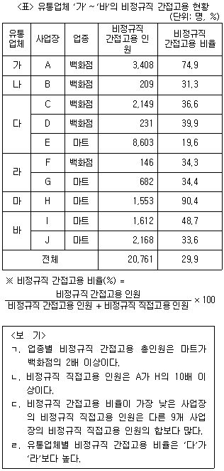 다음 <표>는 유통업체 '가'~'바'의 비정규직 간접고용 현황에 대한 자료이다. 이에 대한 <보기>의 설명 중 옳은 것만을 모두 고르면?