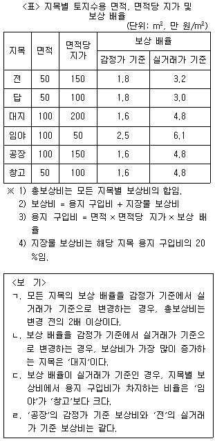 다음 <표>는 6개 지목으로 구성된 A지구의 토지수용 보상비 산출을 위한 자료이다. 이에 대한 <보기>의 설명 중 옳은 것만을 모두 고르면?