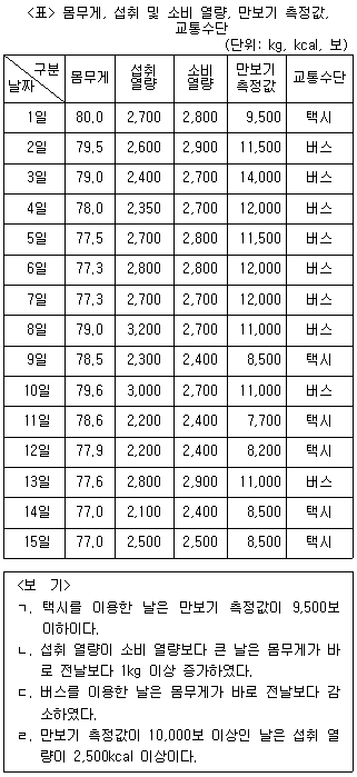 다음 <표>는 2020년 3월 1~15일 '갑'의 몸무게, 섭취 및 소비 열량, 만보기 측정값, 교통수단에 관한 자료이다. 이에 대한 <보기>의 설명 중 옳은 것만을 모두 고르면?