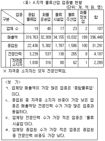 다음 <표>는 A지역 물류산업 업종별 현황에 관한 자료이다. 이에 대한 <보기>의 설명 중 옳은 것만을 모두 고르면?