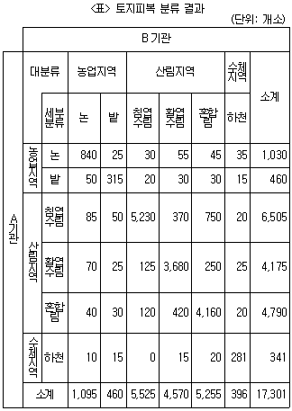 다음 <표>는 '갑'지역 조사 대상지에 대한 A, B 두 기관의 토지피복 분류 결과를 상호비교한 것이다. 이에 대한 설명으로 옳은 것은?