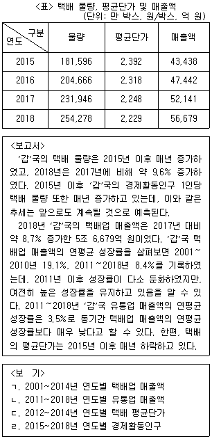 다음 <표>는 '갑'국의 택배 물량, 평균단가 및 매출액에 관한 자료이다. <보고서>를 작성하기 위해 <표> 이외에 추가로 필요한 자료만을 <보기>에서 모두 고르면?