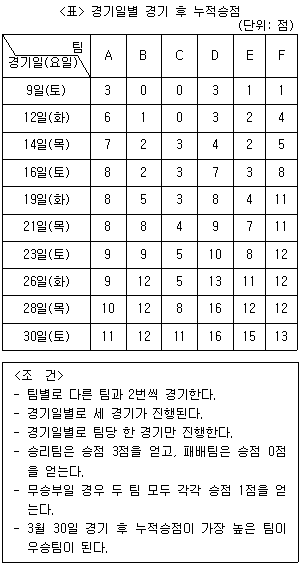 다음 <표>는 2019년 3월 사회인 축구리그 경기일별 누적승점에 대한 자료이다. <표>와 <조건>에 근거한 설명으로 옳지 않은 것은?