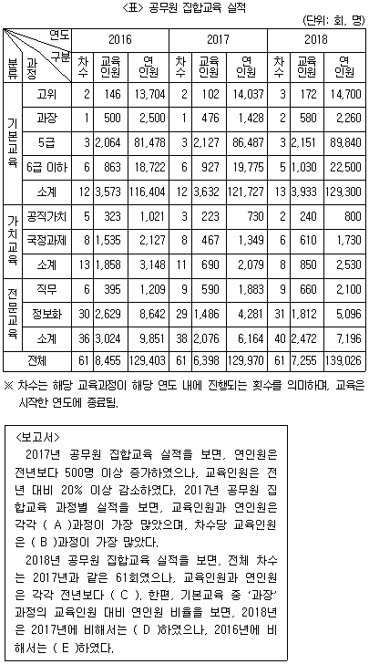 다음 <표>는 2016~2018년 '갑'국의 공무원 집합교육 실적에 관한 자료이다. 이를 바탕으로 작성한 <보고서>의 B, C, D에 해당하는 내용을 바르게 나열한 것은?(순서대로 B, C, D)