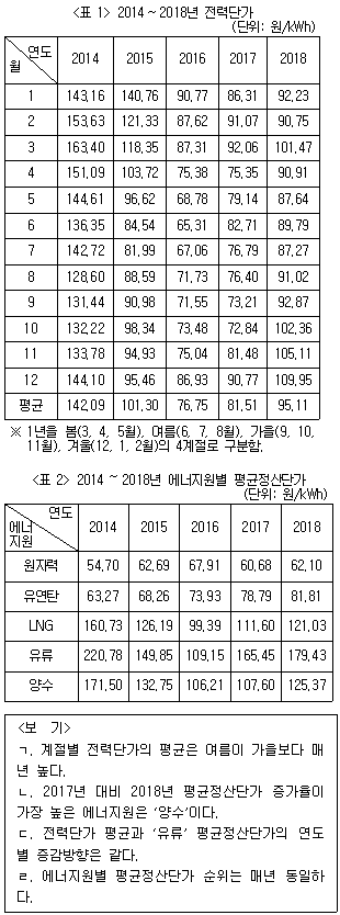 다음 <표>는 2014~2018년 '갑'국의 전력단가와 에너지원별 평균정산단가에 관한 자료이다. 이에 대한 <보기>의 설명 중 옳은 것만을 모두 고르면?