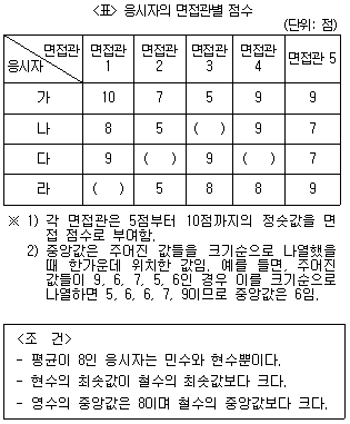 다음 <표>는 4명의 응시자(민수, 영수, 철수, 현수)가 5명의 면접관으로부터 받은 점수에 관한 자료이다. <표>와 <조건>을 근거로 '가'~'라'에 해당하는 응시자를 바르게 나열한 것은?(순서대로 가, 나, 다, 라)
