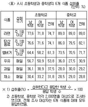 다음 <표>는 A시 초등학생과 중학생의 6개 식품 섭취율을 조사한 결과이다. 이에 대한 설명으로 옳은 것은?
