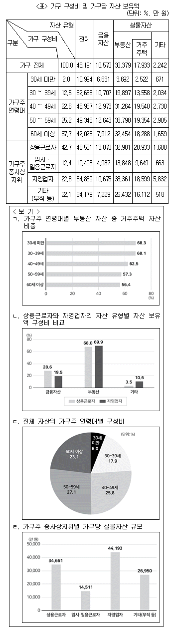 다음 <표>는 2020년 A지역의 가구주 연령대별 및 종사상지위별 가구 구성비와 가구당 자산 보유액 현황에 관한 자료이다. 이를 이용하여 작성한 <보기>의 그래프 중 옳은 것만을 모두 고르면?