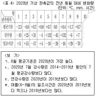 다음 <표 4>는 '갑'지역의 2020년 월별 기상 관측값의 전년 동월 대비 변화량을 나타낸 자료의 일부이다. 위 <표>와 아래 <표 4>를 근거로 <보기>의 설명 중 옳은 것만을 모두 고르면?