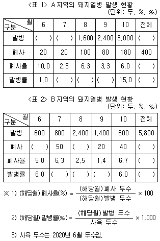 다음 <표>는 A, B지역의 2020년 6~10월 돼지열병 발생 현황에 관한 자료이다. 이에 대한 설명으로 옳은 것은?