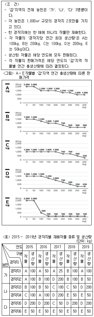 다음 <조건>, <그림>과 <표>는 2015~2019년 '갑'지역의 작물재배와 생산, 판매가격에 대한 자료이다. 이에 대한 설명으로 옳지 않은 것은?