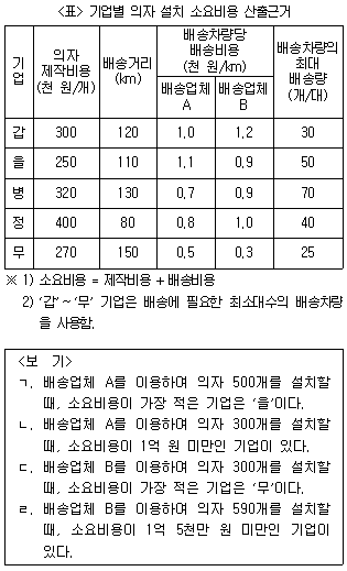 다음 <표>는 S시 공공기관 의자 설치 사업에 참여한 '갑'~'무'기업의 소요비용에 대한 자료이다. 이에 대한 <보기>의 설명 중 옳은 것만을 모두 고르면?