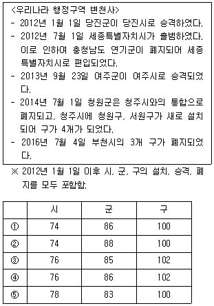 위 <설명>, <표>와 다음 <우리나라 행정구역 변천사>를 이용하여 2012년 6월 30일 광역지방자치단체의 하위 행정구역인 시, 군, 구의 수를 바르게 나열한 것은?