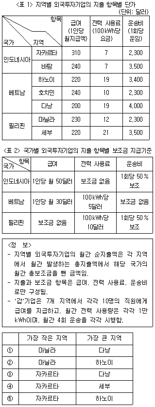 다음 <표>는 2019년 아세안 3개국 7개 지역별 외국투자기업의 지출 항목별 단가 및 보조금 지급기준에 관한 자료이다. <표>와 <정보>에 근거하여 7개 지역에 진출한 우리나라 '갑'기업의 월간 순지출액이 가장 작은 지역과 가장 큰 지역을 바르게 나열한 것은?