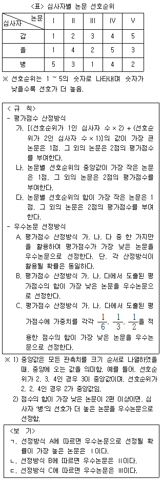 다음 <표>는 어느 학술지의 우수논선정대상 논I~V에 대한 심사자 '갑', '을', '병'의 선호순위를 나열한 것이다. <표>와 <규칙>에 근거한 <보기>의 설명 중 옳은 것만을 모두 고르면?