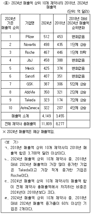 다음 <표>는 2024년 예상 매출액 상위 10개 제약사의 2018년, 2024년 매출액에 관한 자료이다. 이에 대한 <보기>의 설명 중 옳은 것만을 고르면?