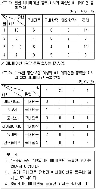 다음 <표>는 2020년 1~4월 애니메이션을 등록한 회사의 애니메이션 등록 현황에 관한 자료이다. 이에 대한 <보기>의 설명 중 옳은 것만을 모두 고르면?