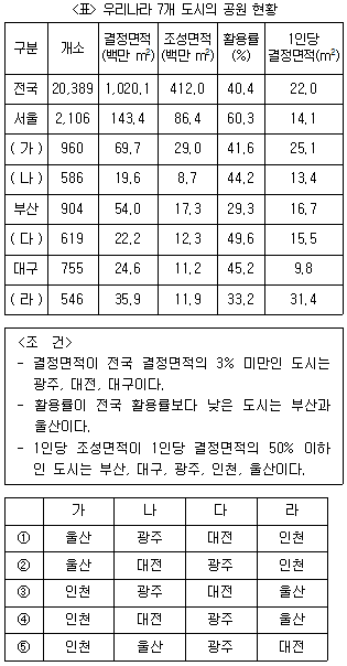 다음 <표>는 우리나라 7개 도시의 공원 현황을 나타낸 자료이다. <표>와 <조건>을 바탕으로 '가'~'라' 도시를 바르게 나열한 것은?