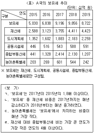 다음 <표>는 2015~2019년 A국의 보유세 추이에 관한 자료이다. 이에 대한 <보기>의 설명 중 옳은 것만을 모두 고르면?