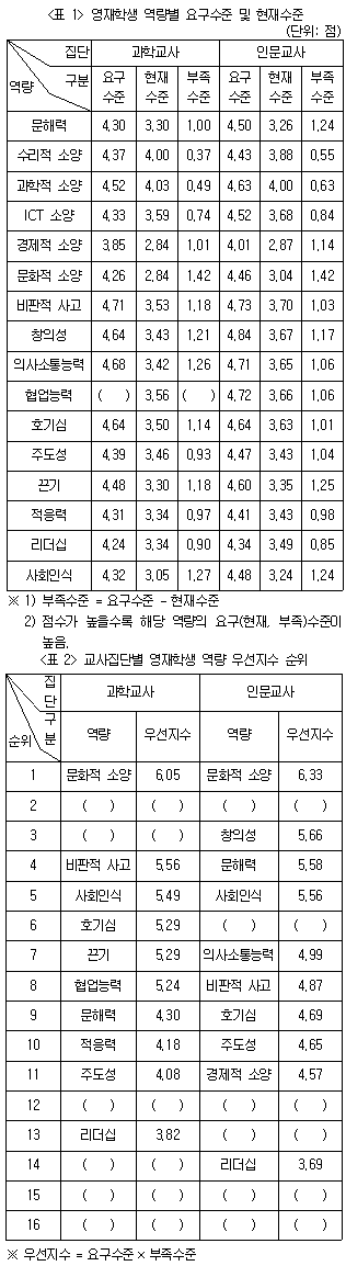 다음 <표>는 영재학생 역량에 대한 과학교사와 인문교사 두 집단의 인식에 대한 자료이다. 이에 대한 설명으로 옳은 것은?