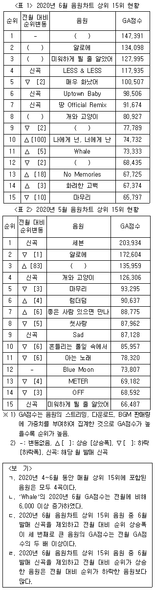 다음 <표>는 '갑'국의 2020년 5월, 6월 음원차트 상위 15위 현황에 대한 자료이다. 이에 대한 <보기>의 설명 중 옳은 것만을 모두 고르면?