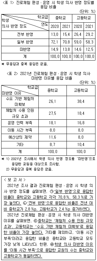 다음 <표>는 2020년과 2021년 각각 '갑'국의 교원 2,000명(중학교 1,000명, 고등학교 1,000명)을 대상으로 진로체험 편성ㆍ운영 시 학생 의사 반영에 관해 조사한 자료이다. 이를 근거로 작성한 <보고서>의 내용 중 옳은 것만을 모두 고르면?