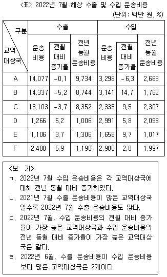 다음 <표>는 '갑'국의 교역대상국(A~F)별 2022년 7월 해상 수출 및 수입 운송비용에 관한 자료이다. 이에 대한 <보기>의 설명 중 옳은 것만을 모두 고르면?